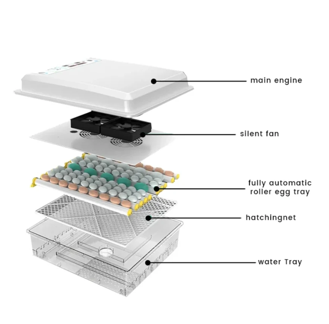 This automatic egg incubator features a and a , ensuring optimal hatching conditions for various egg types. With an LED egg tester light, long work life, and easy-to-use design, it supports capacities up to 100 eggs, suitable for chickens, ducks, geese, and birds. Made of durable ABS material, it offers reliable performance and energy efficiency for farms, homes, and schools.