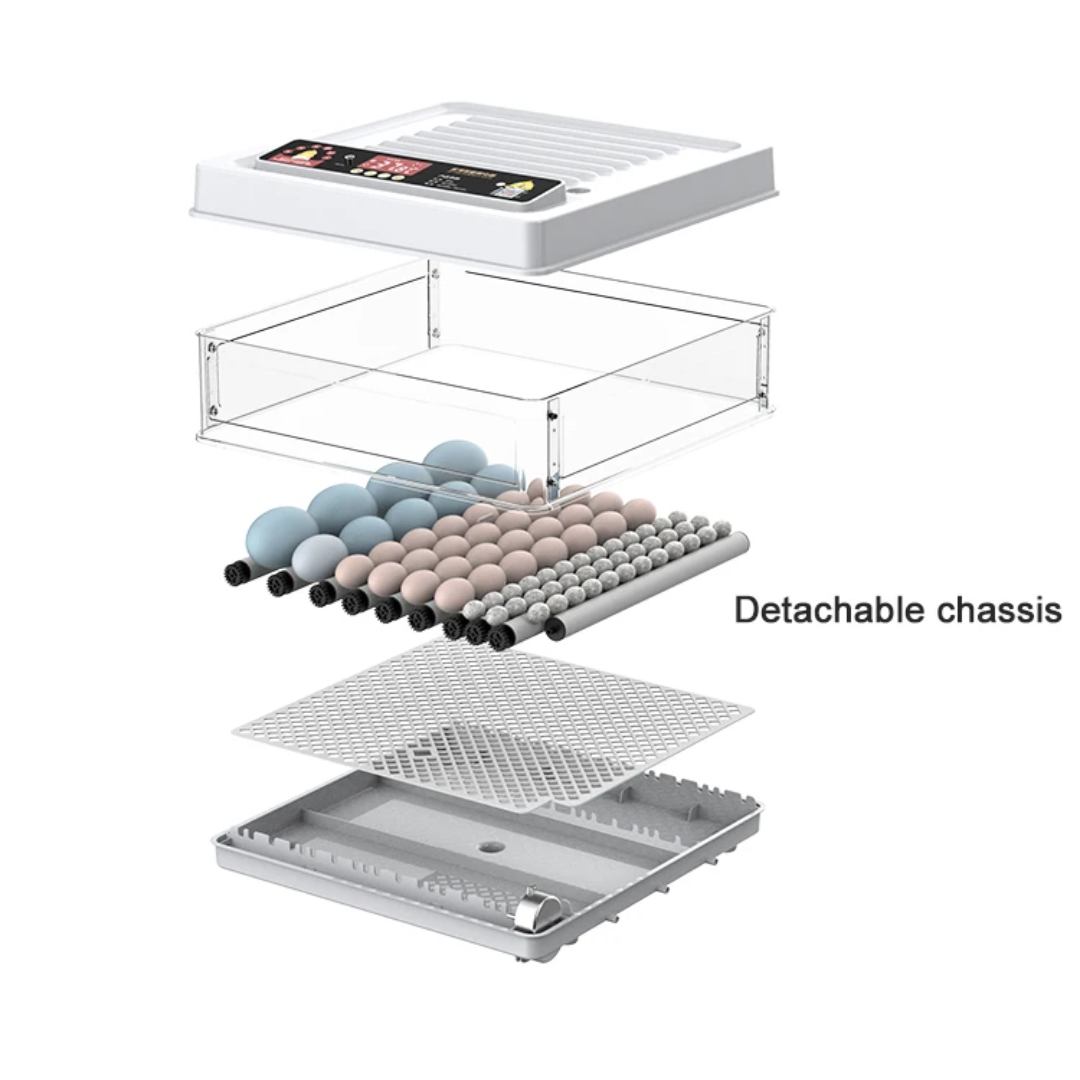 This automatic egg incubator features a and a , ensuring optimal hatching conditions for various egg types. With an LED egg tester light, long work life, and easy-to-use design, it supports capacities up to 130 eggs, suitable for chickens, ducks, geese, and birds. Made of durable ABS material, it offers reliable performance and energy efficiency for farms, homes, and schools.