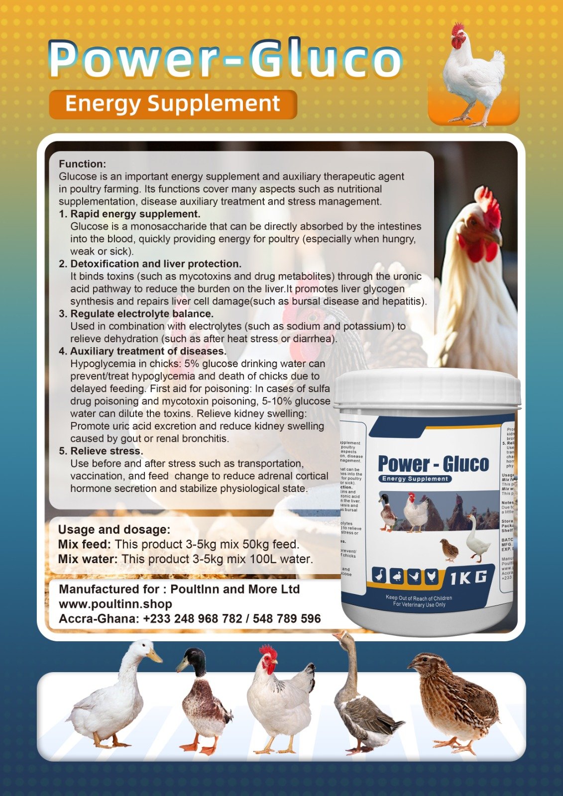 1kg Power- Glucose is an instant energy giving Glucose with Vitamin C and D combined for poultry.